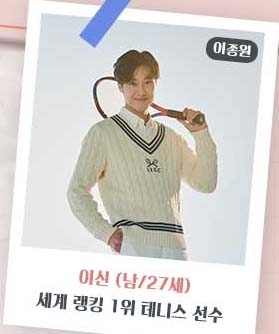 이신 (이종원) : 남/27세. 세계 랭킹 1위 테니스 선수.