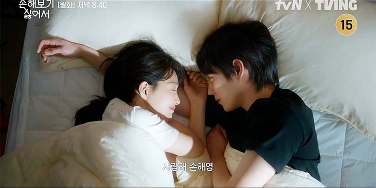 손해 보기 싫어서 7회에서 전남친, 현남편과 한 침대에서 깨어났다? 전날 밤 복기호(최진호) 회장과의 식사 후 만취해 기억이 없는 손해영(신민아)과 김지욱(김영대). 안우재(고욱)는 자기 맘대