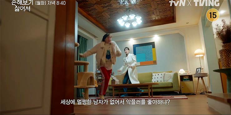손해 보기 싫어서 9회에서 화해 후 달달한 한때를 보내던 손해영(신민아)과 김지욱(김영대). 지욱의 비밀을 알고 찾아온 복규현(이상이)의 등장에 지욱의 옥탑방은 순식간에 아비규환의 현장으