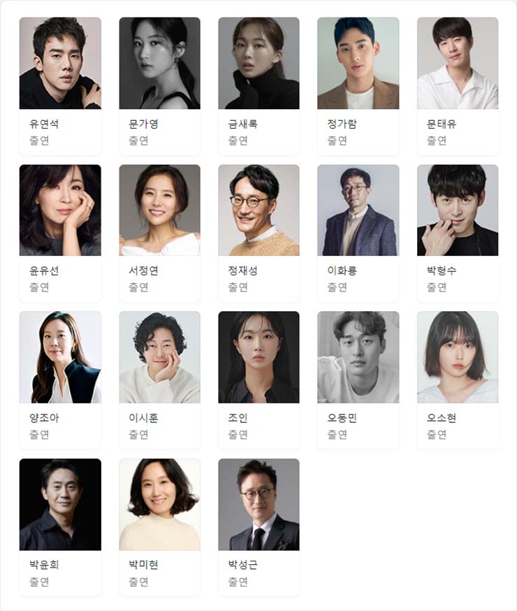 출연진 : 유연석, 문가영, 금새록, 정가람, 문태유, 윤유선, 서정연, 정재성, 이화룡, 박형수, 양조아, 이시훈, 조인, 오동민, 오소현, 박윤희, 박미현, 박성근