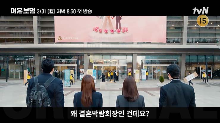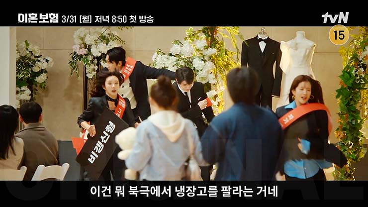 이혼보험 1회에서 웨딩박람회장에서 이혼보험의 필요성을 설파하다 쫓겨날 뻔한 기준과 TF 팀원들. 보험회사 혁신상품개발팀 천재 계리사 기준에게 이혼은 인생의 가장 큰 재난이었다. 기준은