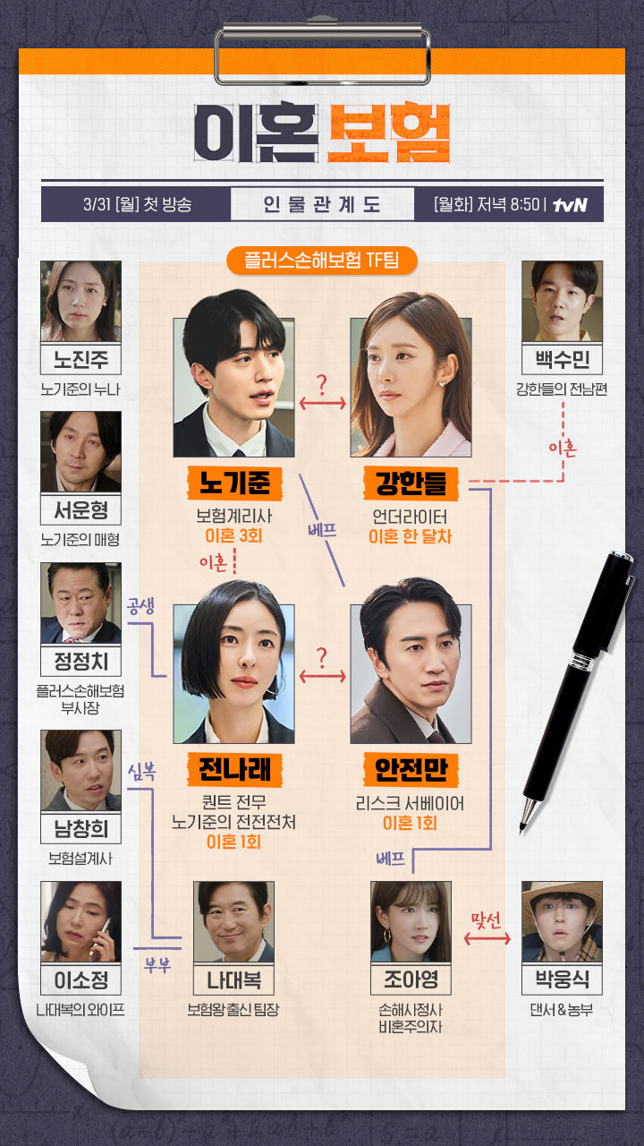 이혼보험은 그놈은 흑염룡 후속으로 2025년 3월 31일(월)부터 방송 예정인 tvN 월화드라마다. 이혼보험은 이혼에도 대비가 필요하다! 최고의 브레인만 모여 있는 플러스 손해보험 혁신상품개발팀