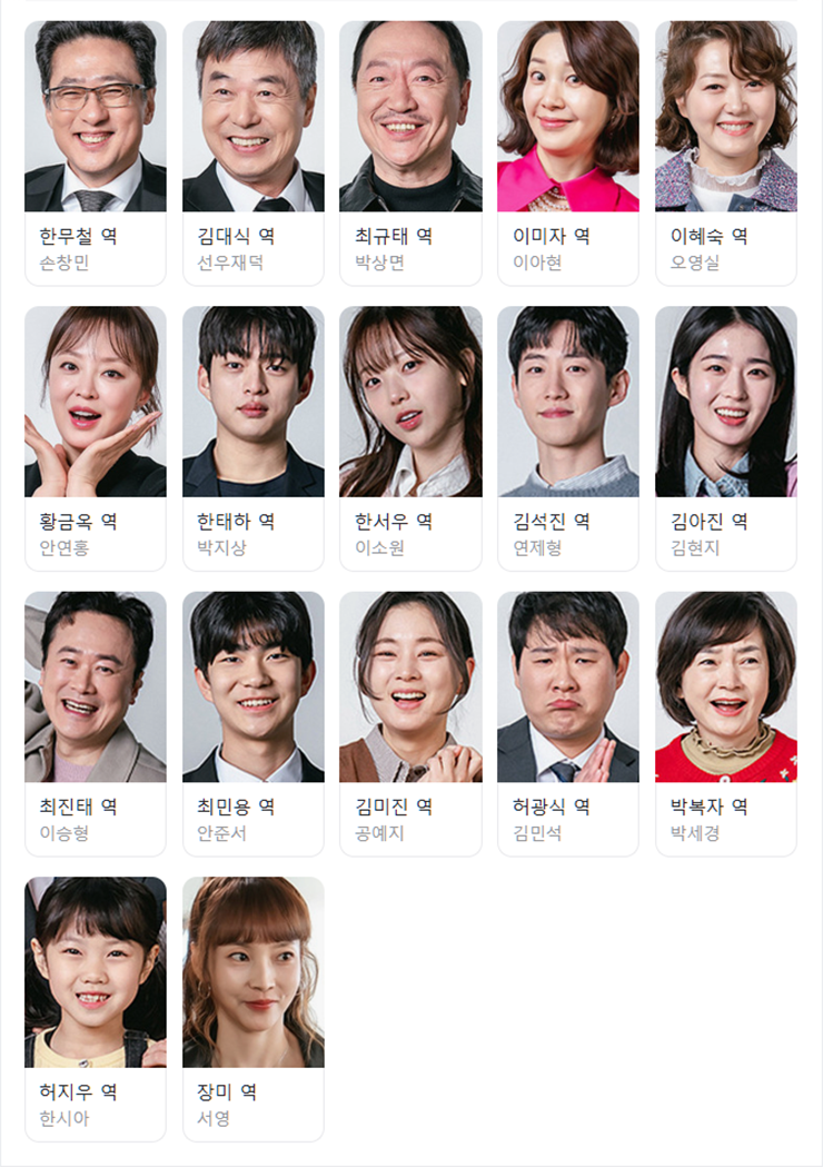 대운을 잡아라 등장인물 (출연진) : 한무철 (손창민), 김대식 (선우재덕), 최규태 (박상면), 이미자 (이아현), 이혜숙 (오영실), 황금옥 (안연홍), 한태하 (박지상), 한서우 (이소원), 김석진 (연제형), 김아진 (김현지), 최진태 (이승형), 최민용 (안준서), 김미진 (공예지), 허광식 (김민식), 박복자 (박세경), 허지우 (한시아) 외