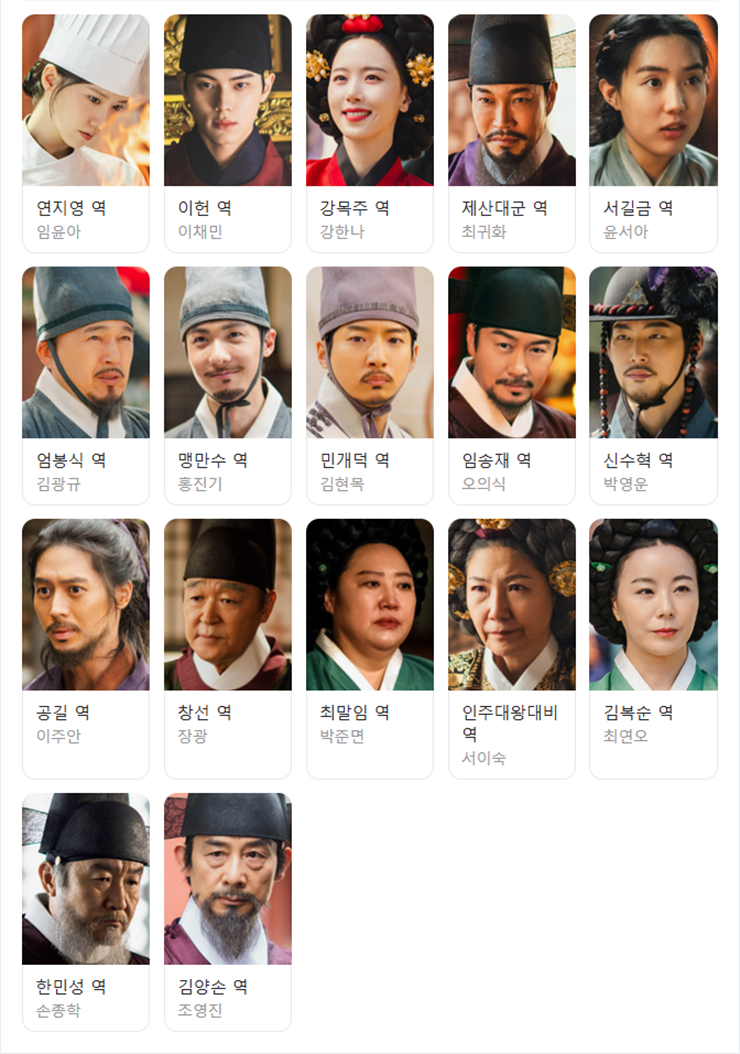 폭군의 셰프 등장인물 (출연진) : 연지영 역 임윤아, 이헌 역 이채민, 강목주 역 강한나, 제산대군 역 최귀화, 서길금 역 윤서아, 엄봉식 역 김광규, 맹만수 역 홍진기, 민개덕 역 김현목, 임송재 역 오의식, 신수혁 역 박영운, 공길 역 이주안, 창선 역 장광, 최말임 역 박준면, 인주대왕대비 역 서이숙, 김복순 역 최연오, 한민성 역 손종학, 김양손 역 조영진