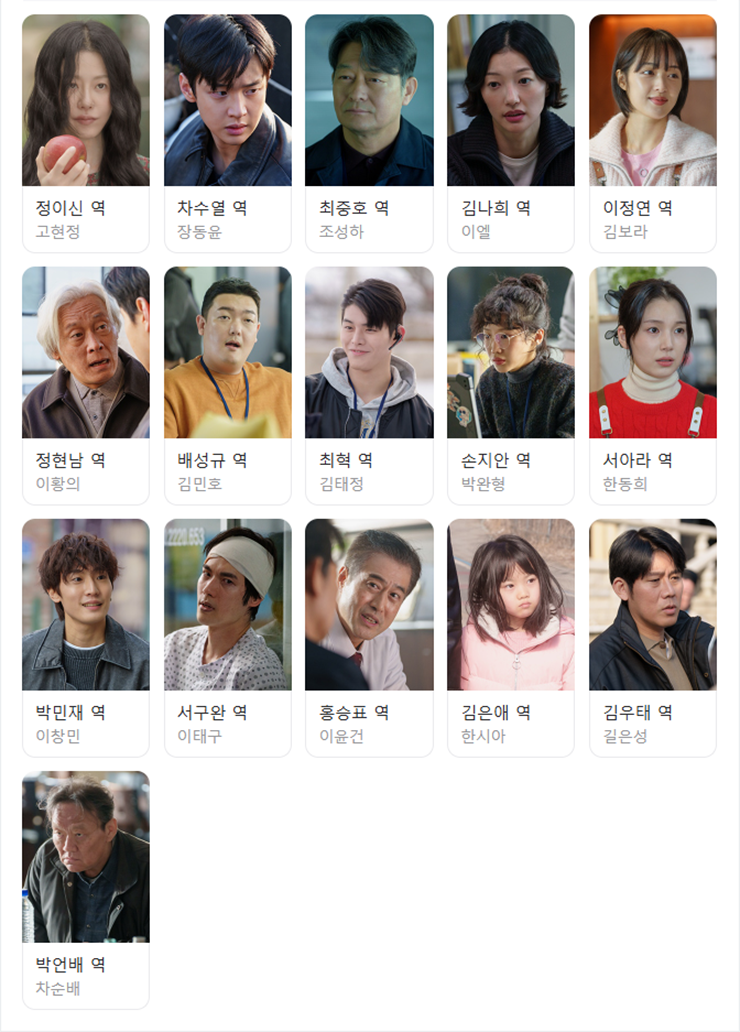 사마귀 : 살인자의 등장인물 (출연자) : 정이신 역 고현정, 차수열 역 장동윤, 최중호 역 조성하, 김나희 역 이엘, 이정연 역 김보라, 정현남 역 이황의, 배성규 역 김민호, 최혁 역 김태정, 손지안 역 박완형, 서아라 역 한동희, 박민재 역 이창민, 서구완 역 이태구, 홍승표 역 이윤건, 김은애 역 한시아, 김우태 역 길은성, 박언배 역 차순배 외