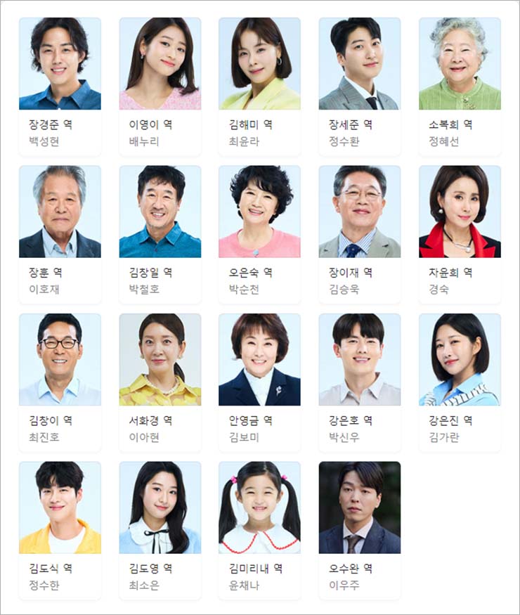장경준 (백성현), 이영이 (배누리), 김해미 (최윤라), 장세준 (정수환), 소복희 (정혜선), 장훈 (이호재), 김창일 (박철호), 오은숙 (박순천), 장이재 (김승욱), 차윤희 (경숙), 김창이 (최진호), 서화경 (이아현), 안영금 (김보미), 강은호 (박신우), 강은진 (김가란), 김도식 (정수한), 김도영 (최소은), 김미리내 (윤채나), 오수완 (이우주) 외