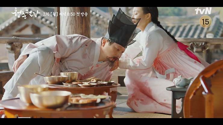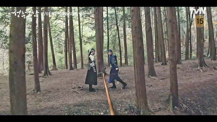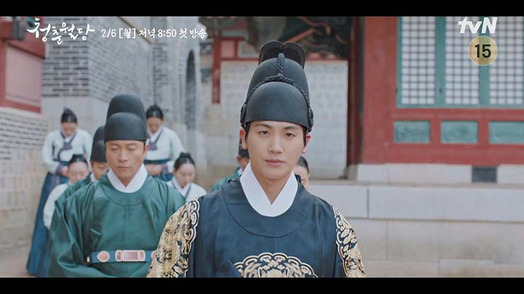 청춘월담 2회 에서 이환은 사냥터에서 새로운 위기에 직면한다. 그 충격으로 얼어붙고, 누구도 믿을 수 없는 상황에 처한다. 민재이는 환에게 결백을 호소한다. 자신의 가족이 죽은 것은 네 탓이
