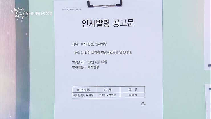 한편, 서태양(이선호)은 자신의 상해치사가 사실은 누명이었다는 것을 알게 됐다. 17일(월) 방송 예정인 비밀의 여자 24회에서 VN그룹과의 계약에 실패한 주애라는 팀장에서 사원으로 발령이 난다.
