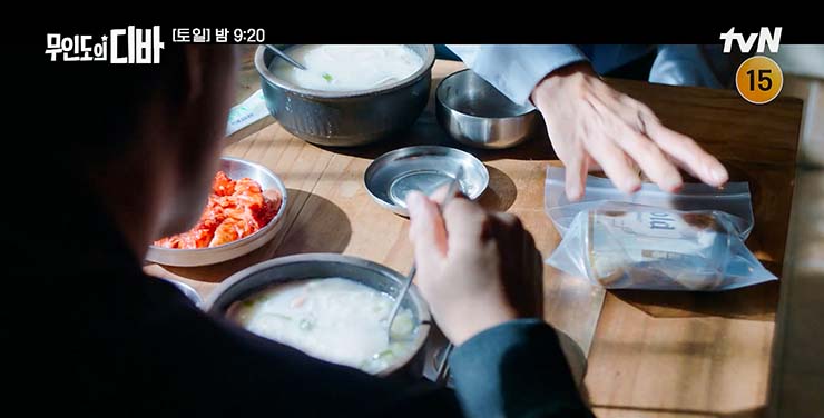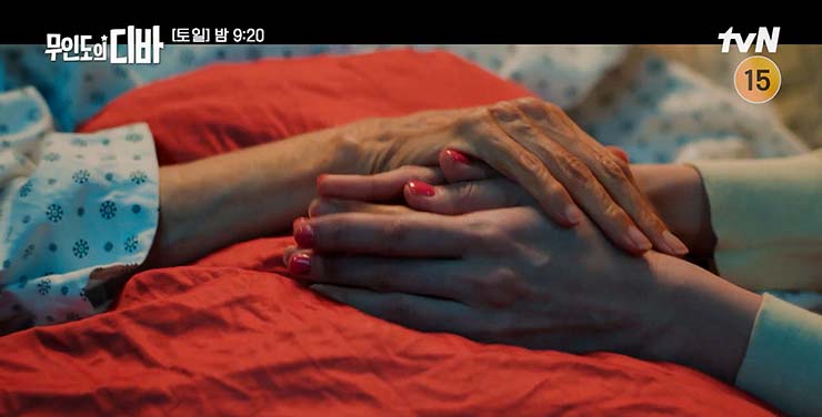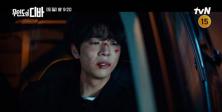 무인도의 디바 9회 : 친부인 봉완 때문에 다친 보걸의 상처를 치료해 주는 목하. 다시는 이런 일이 벌어지지 않을 거라고 위로한다. 그러나 그때 보걸은 몰랐다. 목하는 위로가 아닌 다짐을 하고 있었다는 것을.