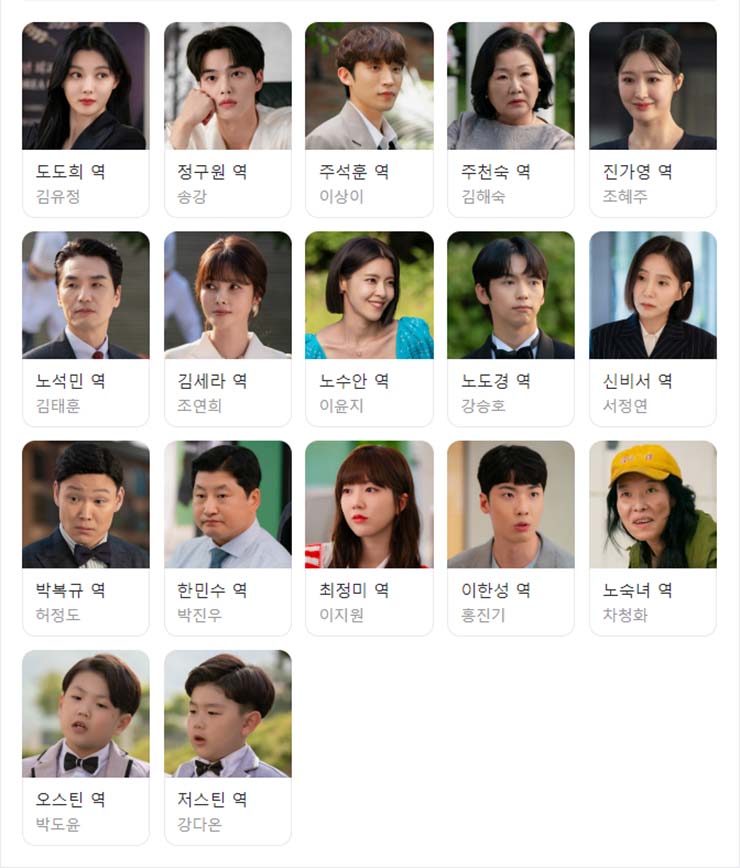 도도희 (김유정), 정구원 (송강), 주석훈 (이상이), 주천숙 (김해숙), 진가영 (조혜주), 노석민 (김태훈), 김세라 (조연희), 노수안 (이윤지), 노도경 (강승호), 신비서 (서정연), 박복규 (허정도), 한민수 (박진우), 최정미 (이지원), 이한성 (홍진기), 노숙녀 (차정화), 오스틴 (박도윤), 저스틴 (강다온) 외