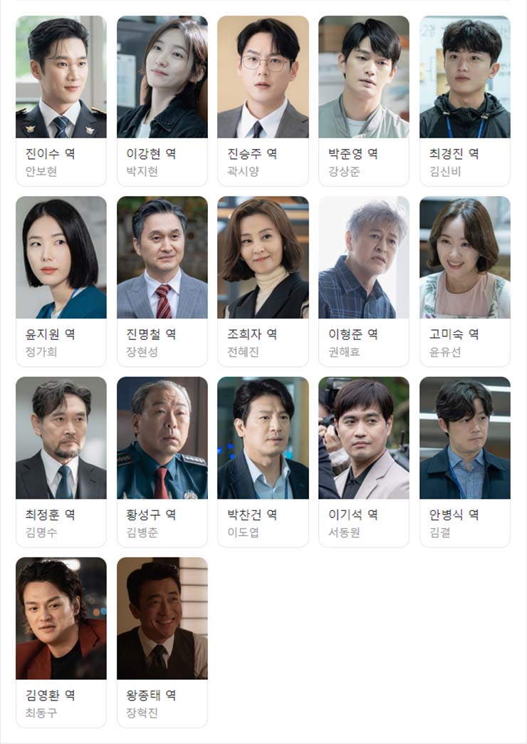 진이수 (안보현), 이강현 (박지현), 진승주 (곽시양), 박준영 (강상준), 최경진 (김신비), 윤지원 (정가희), 진명철 (장현성), 조희자 (전혜진), 이형준 (권해효), 고미숙 (윤유선), 최정훈 (김명수), 황성구 (김병춘), 박찬건 (이도엽), 이기석 (서동원), 안병식 (김결), 김영환 (최동구), 왕종태 (장혁진)